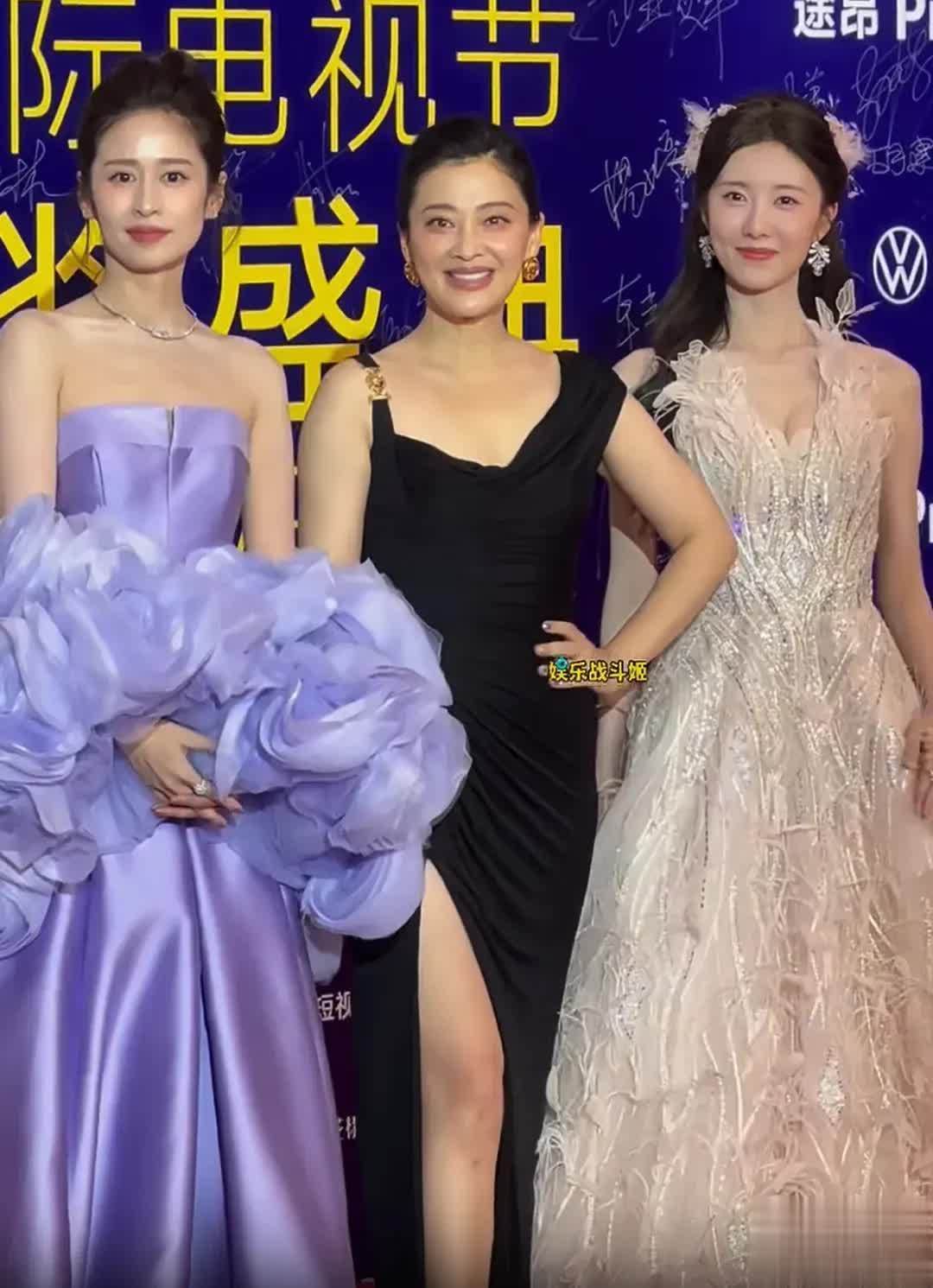 《六姊妹》剧组的颖儿、梅婷、曹斐然,三东谈主的战胜作风不一,各有各的好意思。颖儿穿了一条紫色抹胸战胜,身体纤瘦、身超越众;梅婷穿的是玄色高开叉长裙,气质绝佳;曹斐然的战胜则属于青娥风,单看是排场的,但跟两位姐姐同框就有点不够看了。