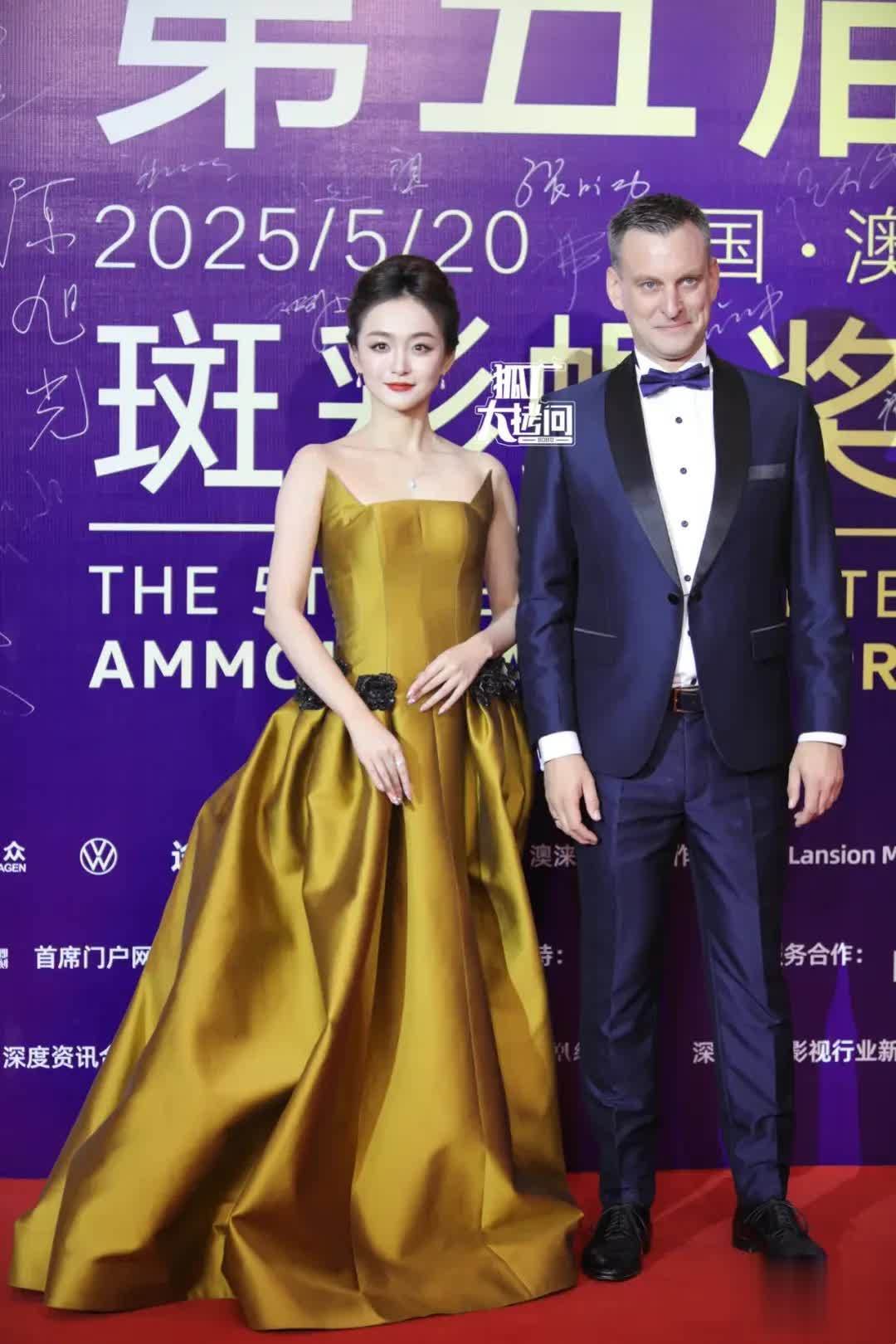 张光北和陈炜浑家则是曲直配的穿搭,前者看起来老到细腻,后者的造型更显年青。