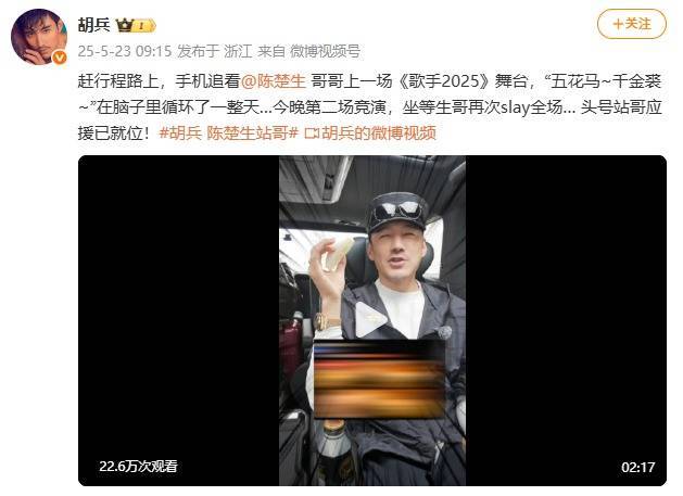 5月23日,胡兵发文:赶行程路上,手机追看@陈楚生哥哥上一场《歌手2025》舞台,“五花马~令嫒裘~”在脑子里轮回了一整天…今晚第二场竞演,坐等生哥再次slay全场…头号站哥应援已就位!