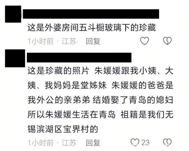 曝光朱媛媛全家福的是一位网友,她说朱媛媛跟她阿姨、小姨、和她姆妈是堂姐妹。