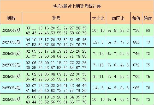 福彩高慢8第2025055期开出奖号:05 06 07 18 19 20 31 34 35 37 43 44 50 52 56 59 61 63 77 78,其中奖号大小比为10:10,四区比为6:4:6:4,和值为795,跨度为73。