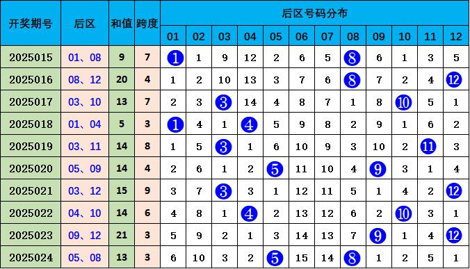 后折柳析:上期后区开出05 08,跨度3,近十期跨度是:7 4 7 3 8 4 9 6 3 3,波动领域较大,跨度领域在3-9之间,本期瞻望跨度值不变,重心温雅号码01 04,跨度3。