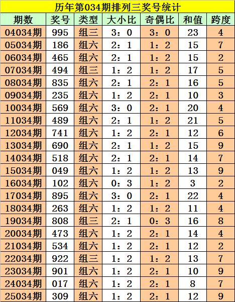 罗列三第2025034期奖号:309,和值12,跨度9,大小比1:2,奇偶比2:1。