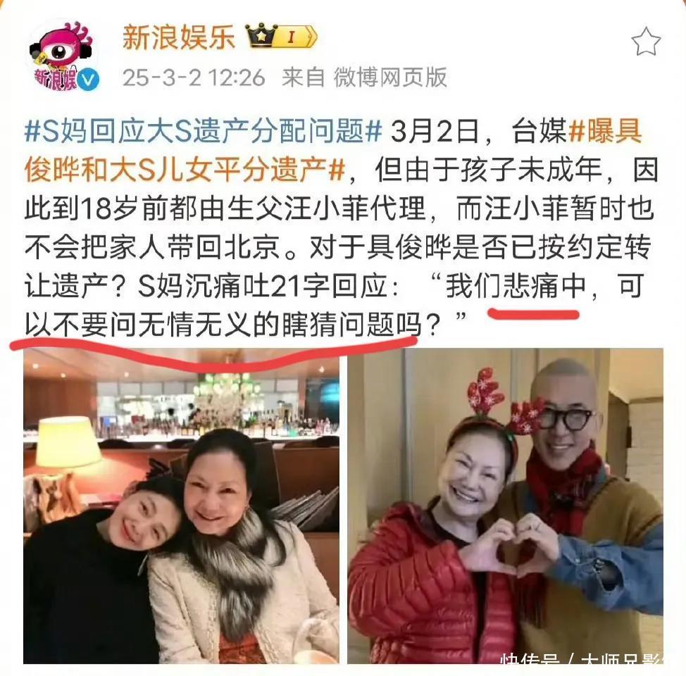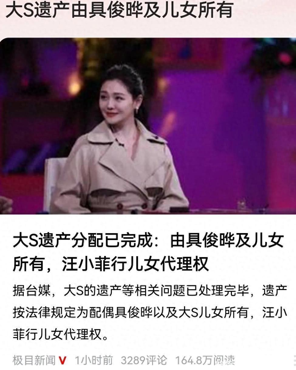 把柄台湾媒体报说念,现时大S的无数遗产一经分拨完成,具俊晔和两个孩子均分,其中,两个孩子因为暂未成年,份额有汪小菲代管。