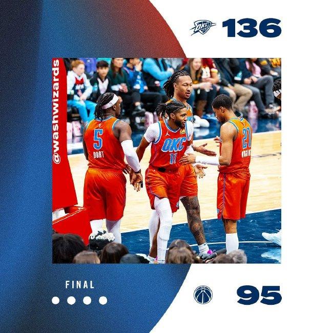 雷霆(32-6):亚历山大27分7篮板4助攻、维金斯23分9篮板4助攻、华莱士14分5助攻、杰伦-威廉姆斯17分6篮板、多特11分、哈尔滕施泰因10分12篮板、肯里奇-威廉姆斯10分4篮板