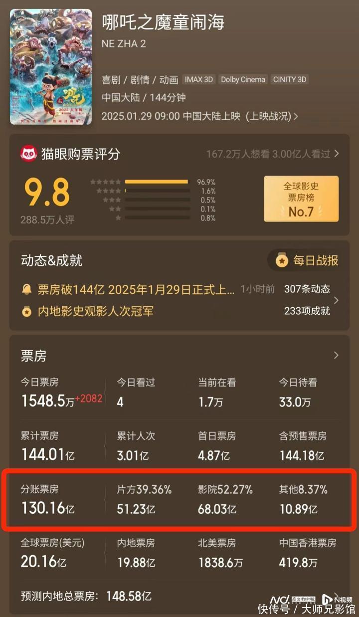 电影《哪吒之魔童闹海》(以下简称《哪吒2》)已上映一个多月,在屡破记载确当下话题不停。“吒儿”脚踏风火轮接住了百亿票房“泼天高贵”,不雅众燃情助力,全行业合力“托举”。截止发稿时辰,《哪吒2》上映38天,累计成绩票房超146亿元,全球影史票房榜暂列第七。此外,《哪吒2》将蔓延放映至3月30日,AI磋商总票房为148.58亿元。在“百亿票房”背后,“巨款”又该何如分账?近日,南都记者对话多位业内东说念主士,揭秘一部电影的票房该何如分账。