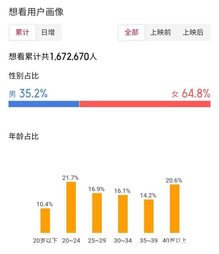 沈开国还不雅察到,《哪吒2》的不雅众群体如故远远超出了影院平时的常客范畴,许多平时很少进影院的不雅众也因为这部电影而走进了影院。南都记者通过数据平台的思看用户画像上了解到,不雅看《哪吒2》的性别占比为:男35.2%、女64.8%,其中20至24岁购票用户达到了最高值21.7%,40岁以上的用户达到了20.6%。