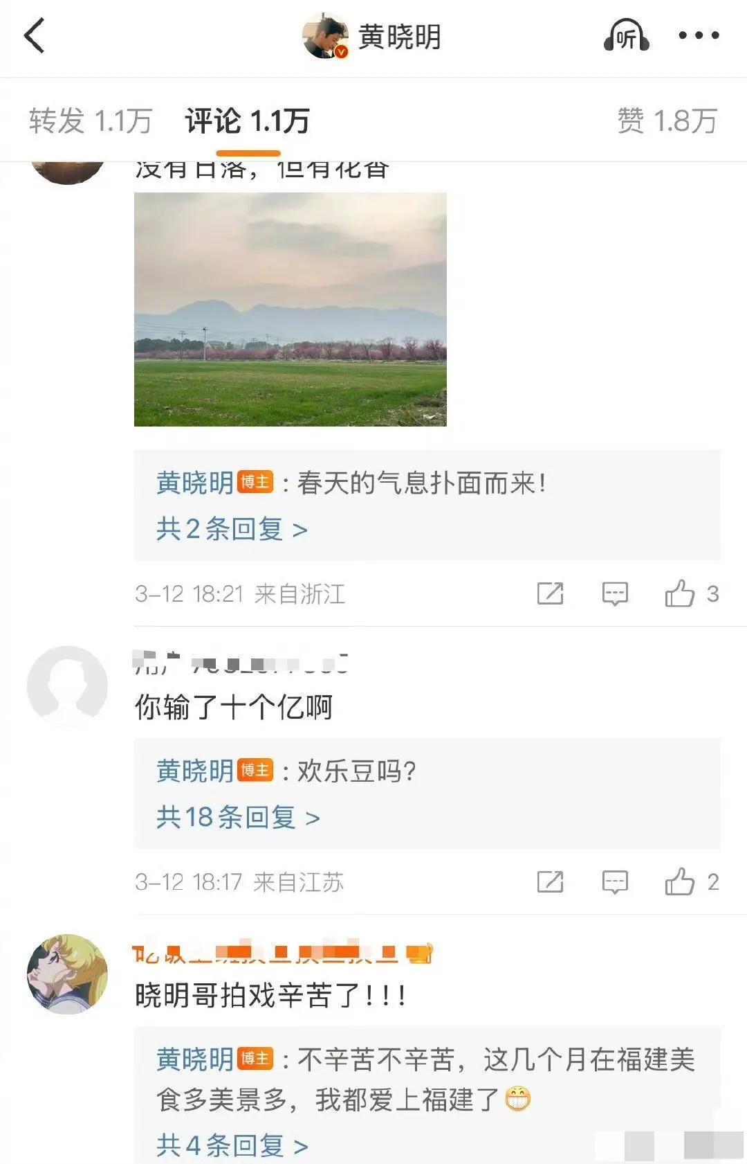 后果这事儿还没完,又有东谈主把苗头指向黄晓明。3月12号黄晓明在酬酢平台共享日落图,挑剔区一下吵杂起来,有网友径直问:“你输了十个亿啊?” 没思到黄晓明回复超幽默,径直来了句:“昂扬豆吗?”