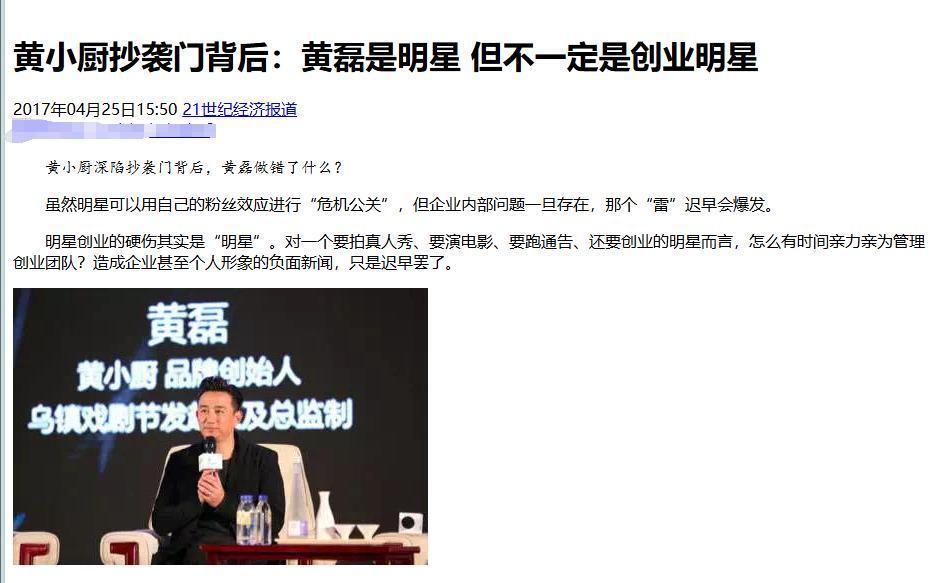 信息起首:21世纪经济报说念 2017-04-25 黄小厨抄袭门背后:黄磊是明星 但不一定是创业明星