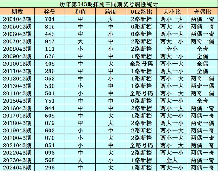 历史上第2025043期摆列三已开出21期奖号了,积年同时奖号永诀为:704、845、445、947、111、626、408、286、352、530、501、751、944、508、079、603、070、054、096、568、296,详备统计见下表: