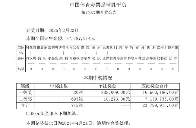 北京技巧2月23日,足彩第25027期开奖成果揭晓。本期一等奖开出20注,单注奖金833,009元,二等奖开695注10,273元,任九开3,689注4,231元。本期足彩销量为37,187,914元,任九投注总数为24,391,140元。
