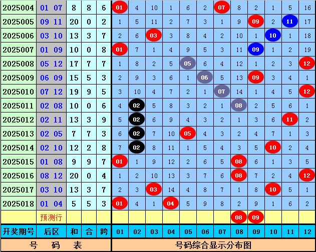 后区:上期开出奖号01+04,最近30期这两码永诀开出7次和5次,其下期落号奇偶比为14:6,大小比为10:10,012路比为7:7:6,本期后区防范号码04、06、08、09、10。