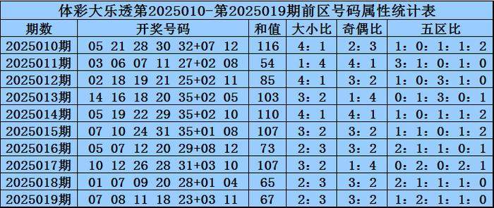 体彩大乐透第2025019期奖号为:07 08 11 18 23+03 11,前区奖号和值开出67,大小比为2:3,奇偶比为3:2,五区比开出1:2:1:1:0。