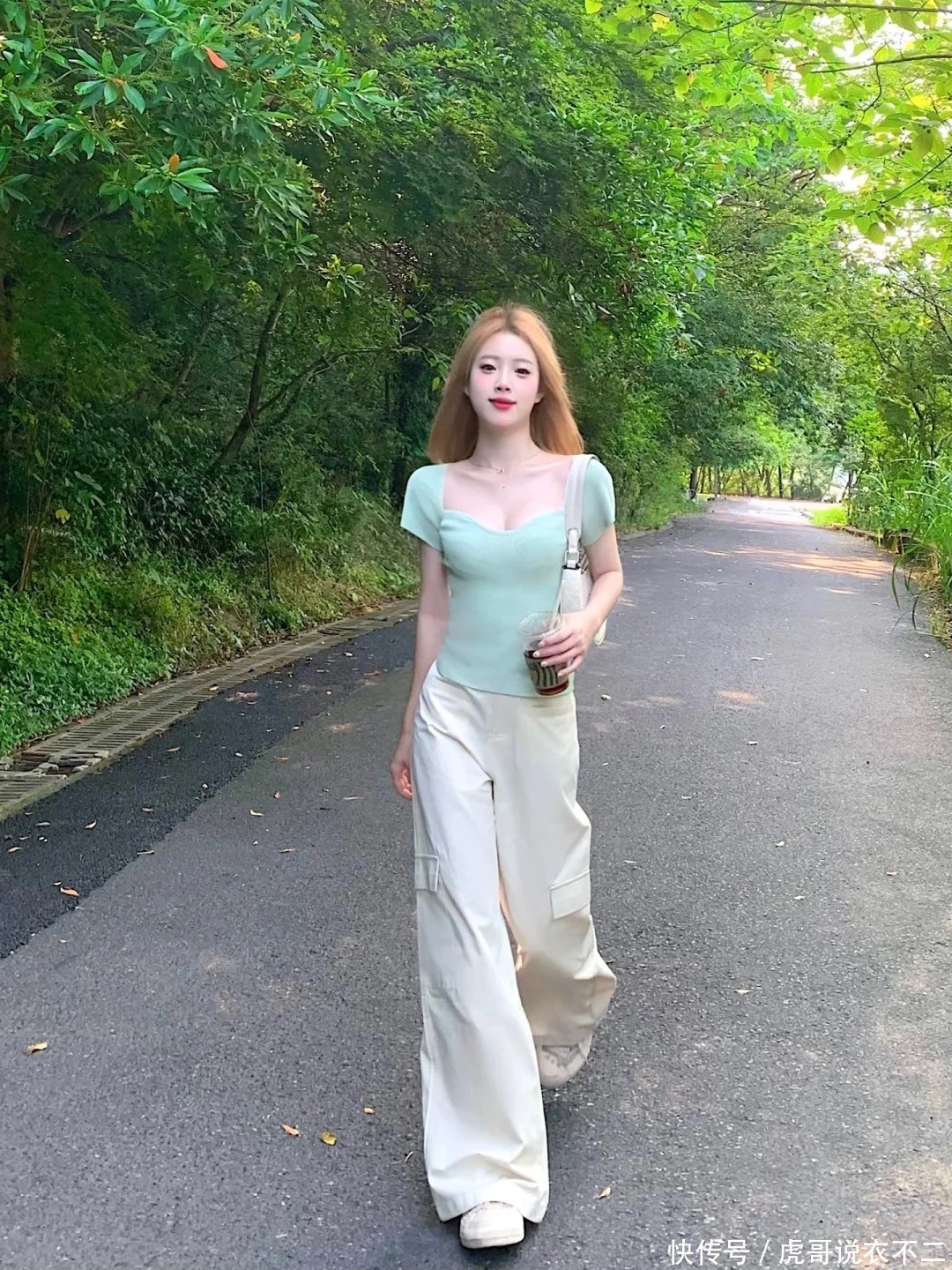 短款的薄荷绿T恤,下半身选拔高腰阔腿裤,薄荷绿自带的清凉感陡然中庸夏季的酷暑。裤长淡漠选拔拖地项目,搭配厚底老爹鞋,偷偷拉长腿部比例。包包推选与裤子同色,整套look显得从简又不失灵动感!