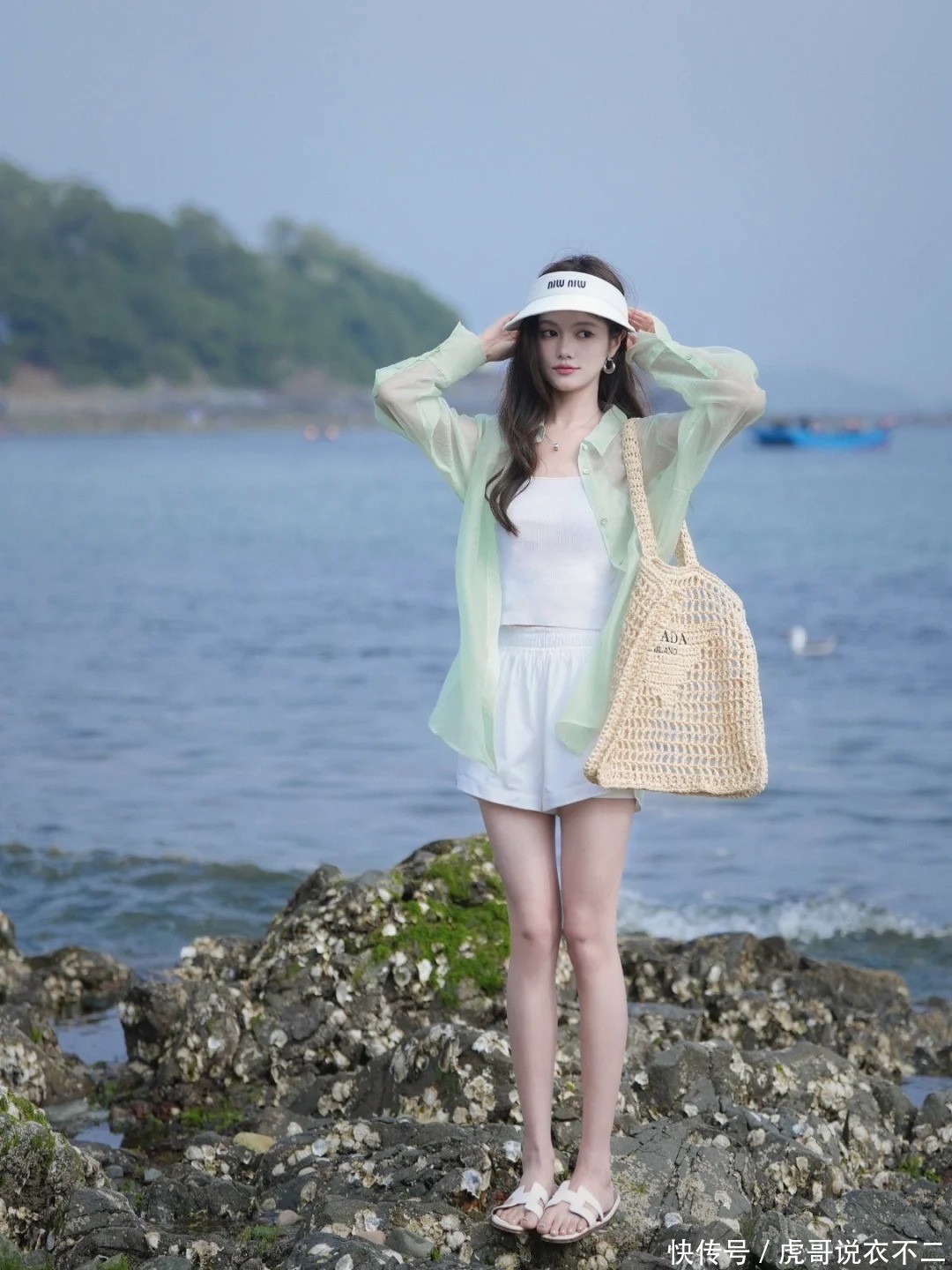 oversize衬衫当防晒衣穿,内搭白色吊带背心,下装选拔A字版型短裤。选拔高腰版型裸露腰线更显高。搭配编织包和凉鞋,用白色遮阳帽打造新鲜的夏季度假风,海边度假这样穿既防晒又出片。