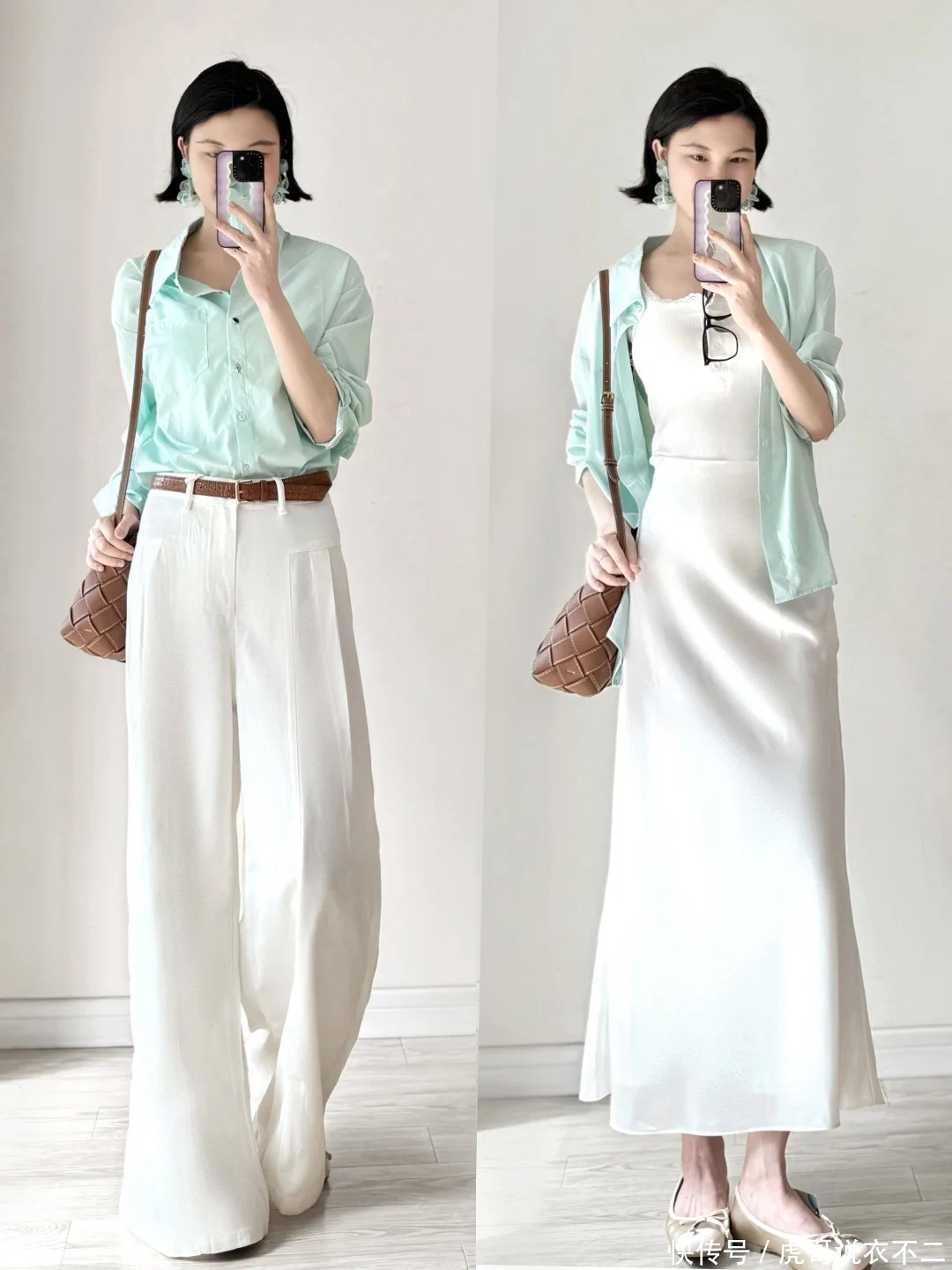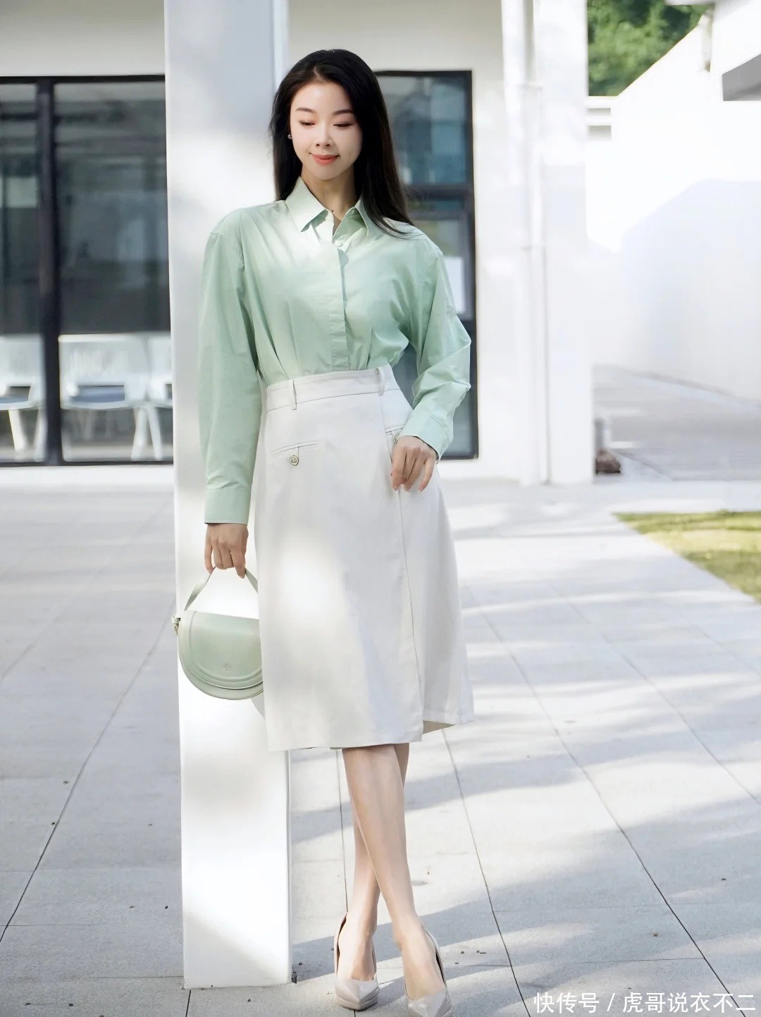 2. 薄荷绿衬衫+白色一步裙|通勤天花板