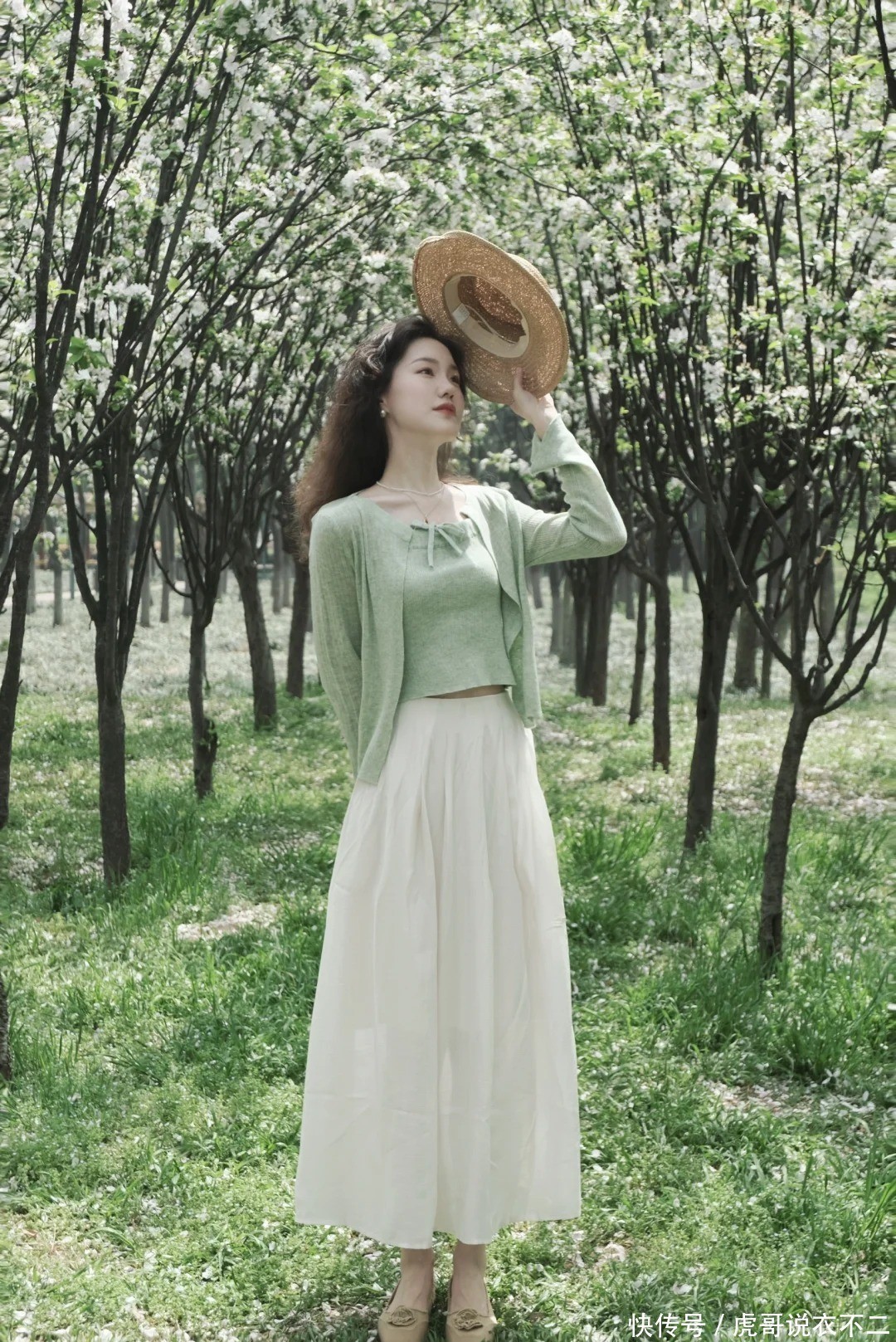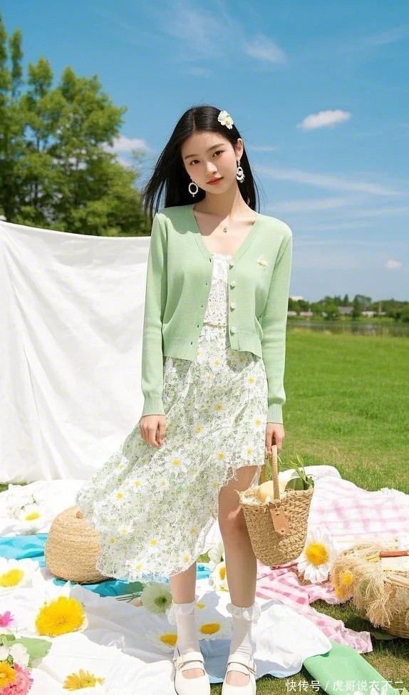2. 薄荷绿诚恳开衫+同色系碎花裙|高档感叠穿