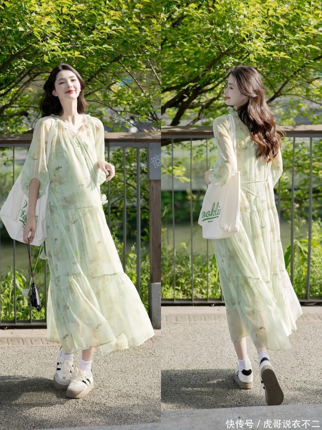 选拔小雏菊或藤蔓印花点缀的薄荷绿长裙,V领绸缪拉长脖颈线条,A字裙摆藏肉又显瘦。搭配白色帆布包来点缀造型,仿佛刚从油画里走出来的森系仙女。鞋子可选白色平底鞋或者畅通鞋,既有尺度优雅,又不失邻家女孩的俏皮感。