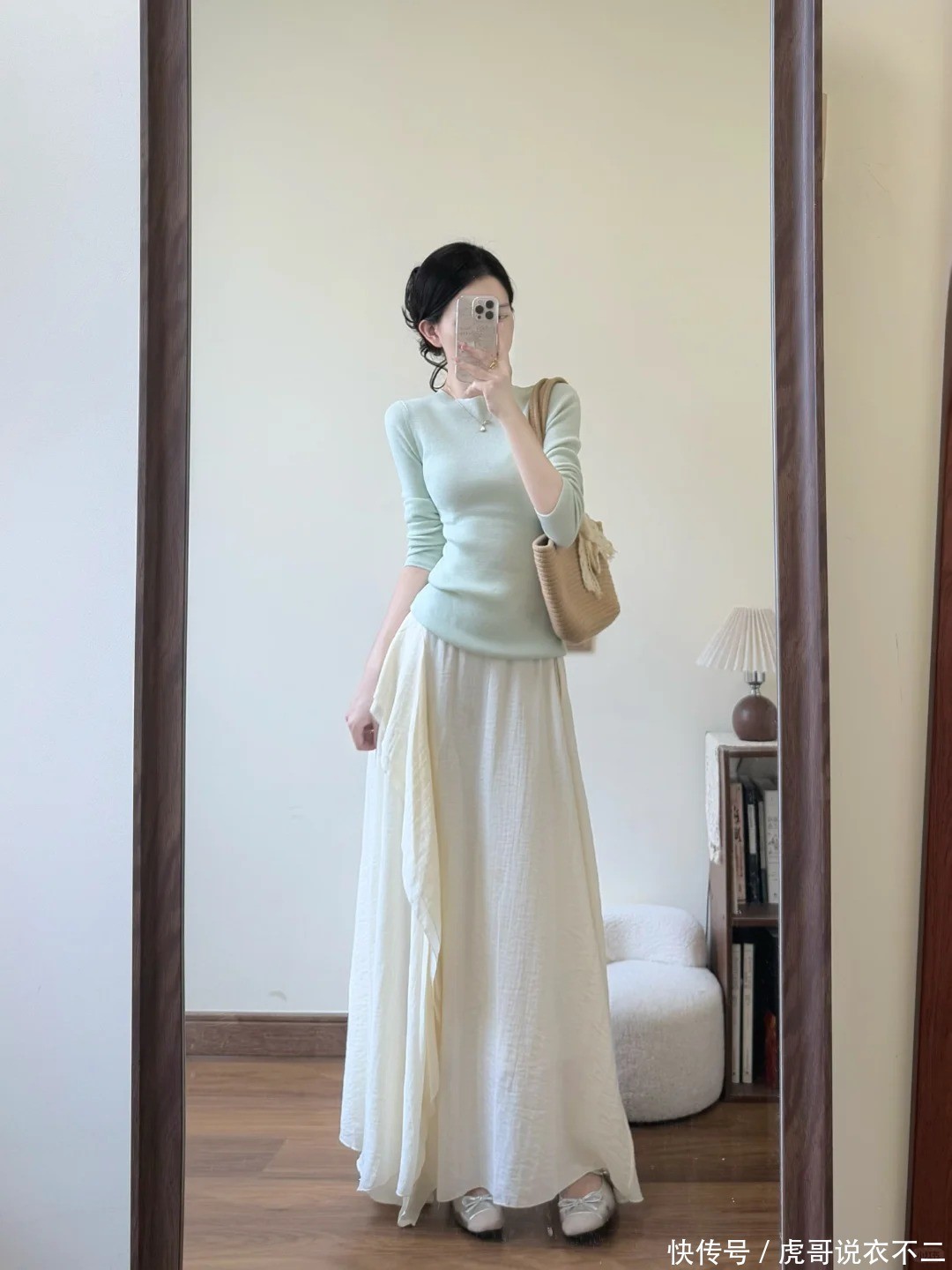 4. 薄荷绿修身诚恳+白色半裙|轻奢名媛风
