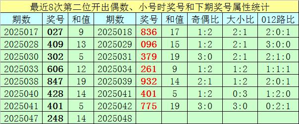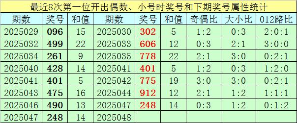 上期转头:福彩3D第2025047期开出奖号为248,奖号奇偶比为0:3,大小比为1:2,012路比0:1:2。