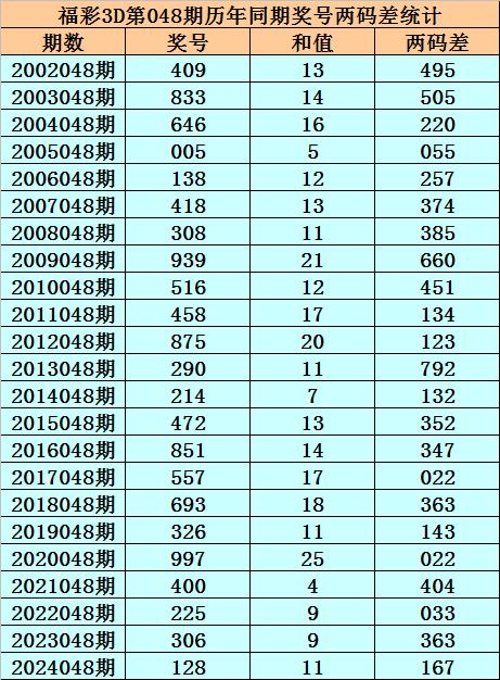 福彩3D第048期,历史上期开出23次奖号,其奖号永诀为:409、833、646、005、138、418、308、939、516、458、875、290、214、472、851、557、693、326、997、400、225、306、128,奖号两码合差永诀开出: