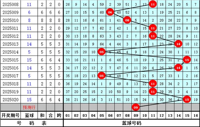 蓝球大小:近50期蓝球大小比为33:17,大号蓝球占优,近10期蓝球大小比为8:2,大号蓝球较热,本期留意大号蓝球09、10。