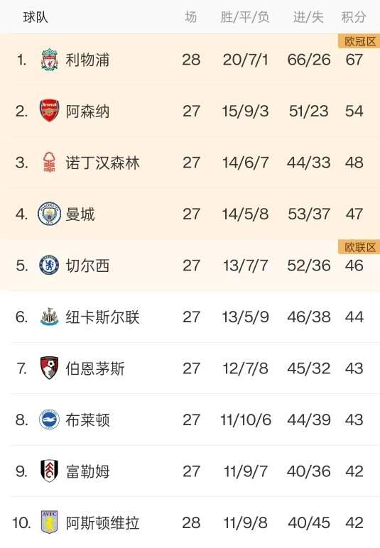 英超积分榜上,利物浦28场67分自成一档,阿森纳27场54分亦然唯独档,不外排行3-10的球队,积分咬得至极紧: