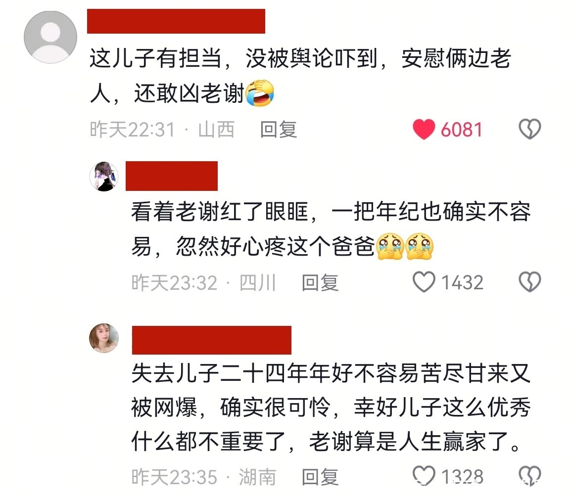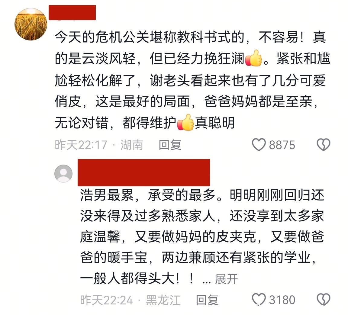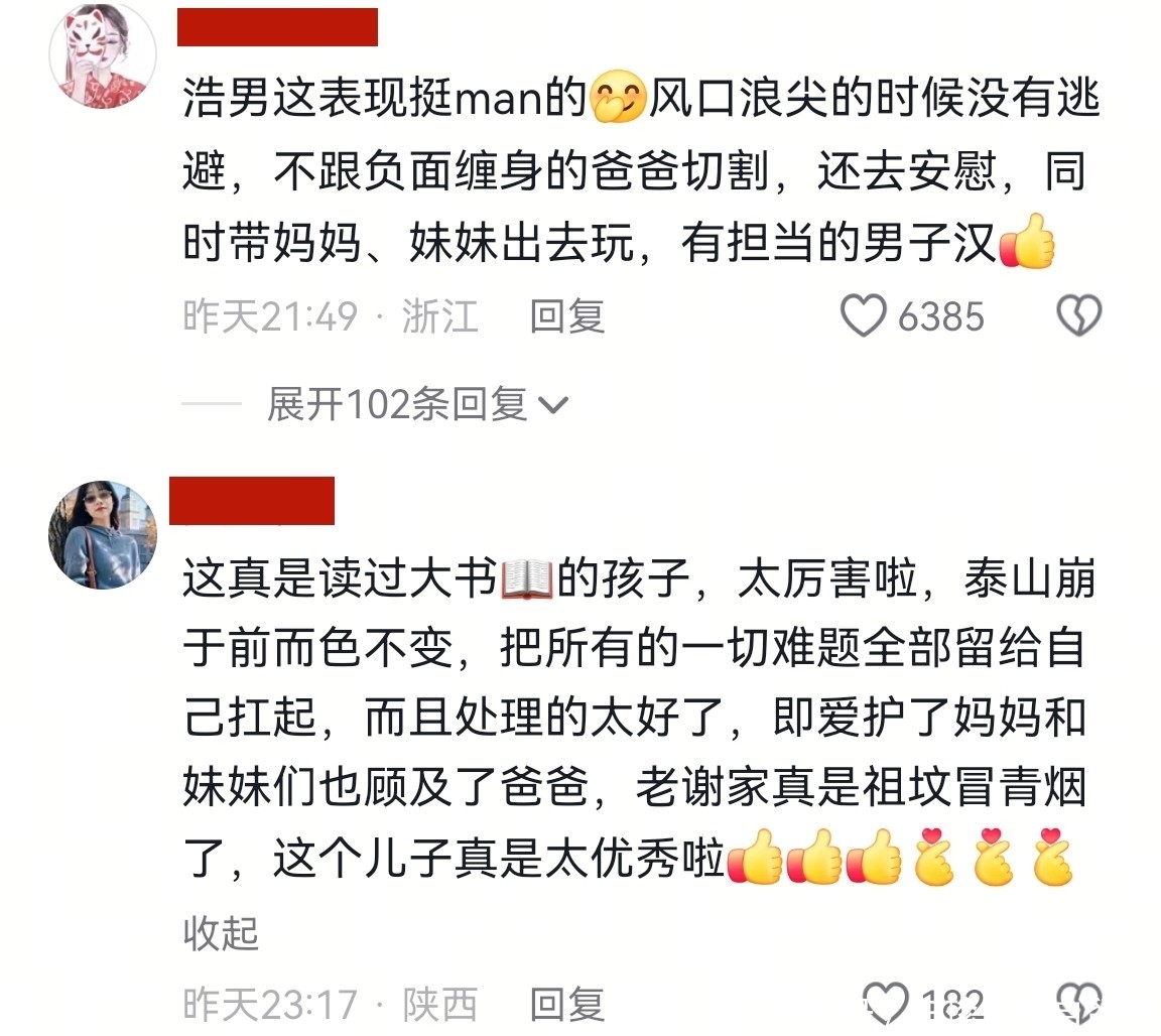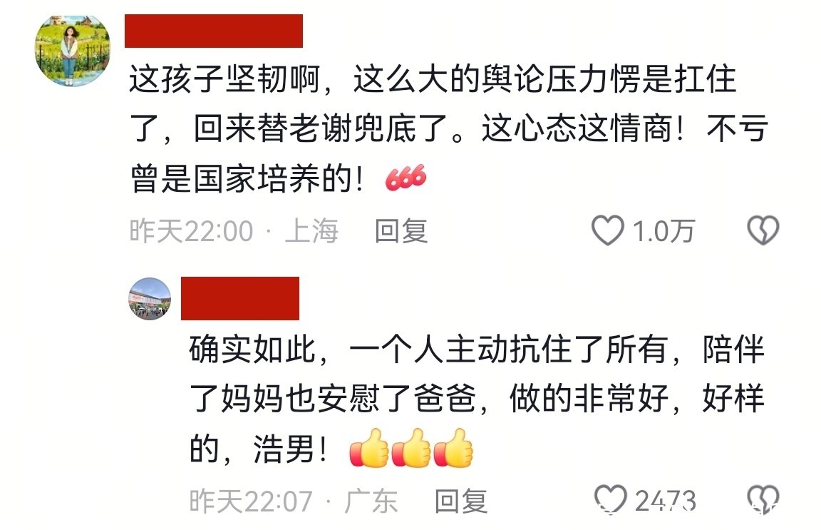 有网友说谢浩男一个东谈主扛住了所有,跟随了姆妈,抚慰了爸爸,作念得高出好。