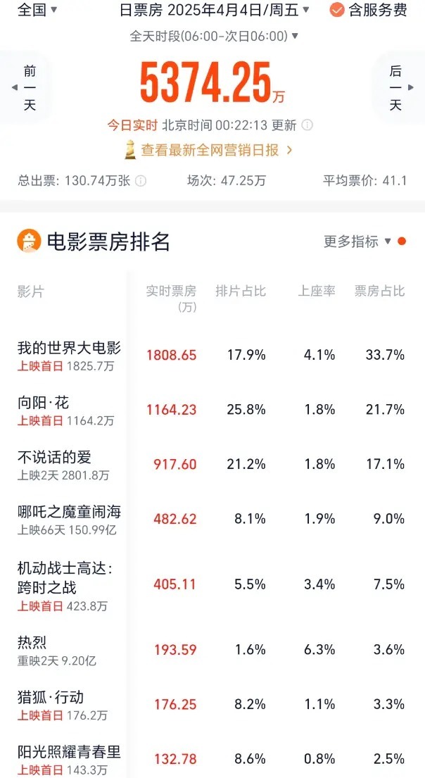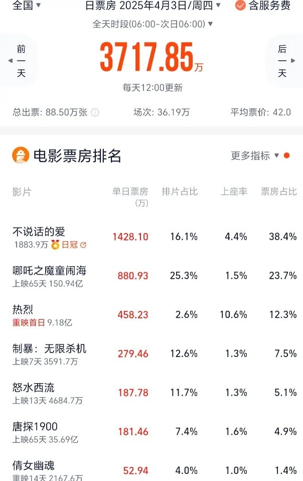 4月3日,晴明档电影《不言语的爱》抢跑上映,于当晚18点负责起片,以16.1%的排片拿到了1428万元票房,上座率4.4%,远高过《哪吒2》。