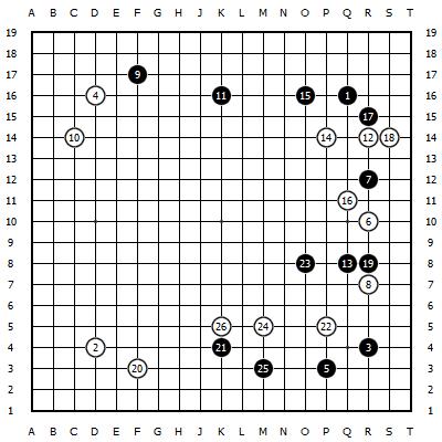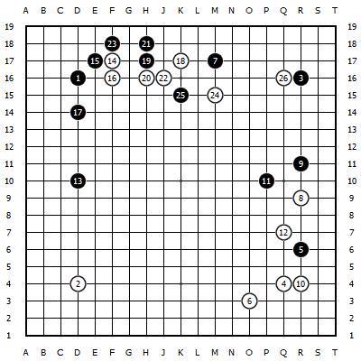 黑19打入拆三,接着21立苛刻,白24镇,黑25签订,白26靠,两边插足复杂的缠斗。