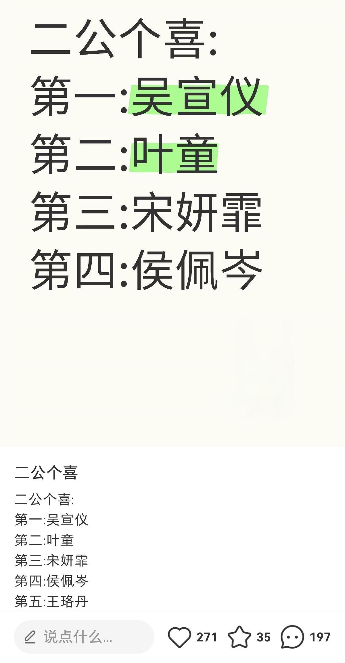 左证知情东谈主士暴露,第二轮舞台公演,姐姐们的名次大洗牌,有两位姐姐得胜“逆袭”,排在前五名的姐姐差异是:吴宣仪、叶童、宋妍霏、侯佩岑、王珞丹。