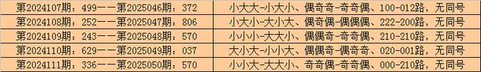 在罗列三历史开奖中,第2024107期-第2024111期连系5期奖号为:499-252-243-629-336。