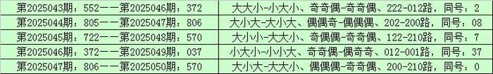 统计罗列三已开出的奖号发现,在连系5期(第2025043期-第2025047)奖号为:552-805-722-372-806。