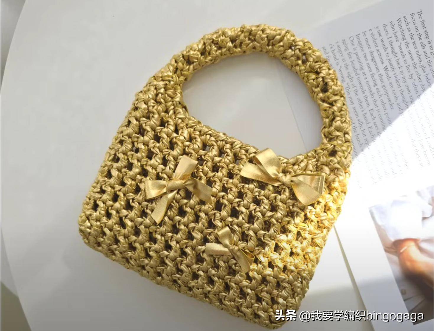 偶然用对一款别致的线材,或是有一个很好意思的配色,即使是一款很简便的作品也能变得不落俗套,非常亮眼。今天咱们学习的是一款金属色小手拎包的钩法,示范用线:金属色布条线,4.5mm的钩针,示范款小包的尺寸为:宽约22厘米,总高度(底部至提手)约26厘米。