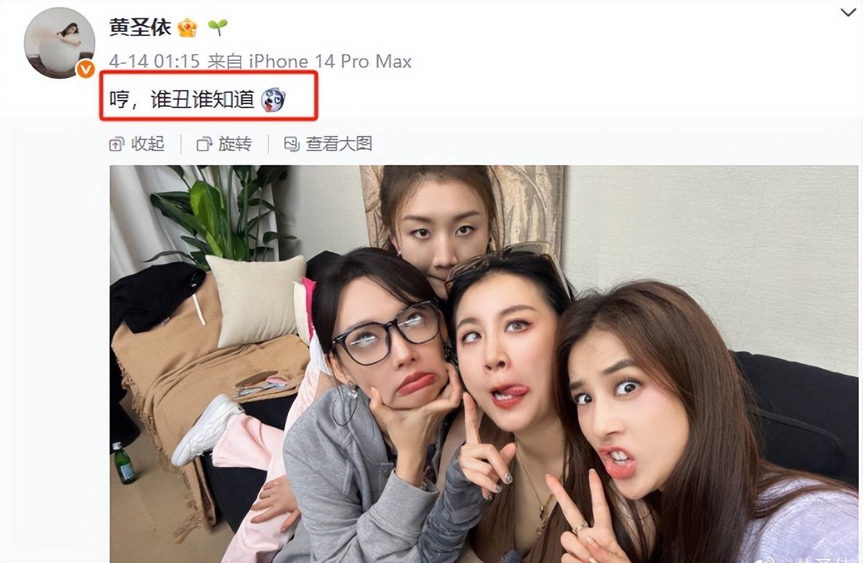 黄圣依玩得相配欢快,本日还有利晒了照,像片中她和陈梦等4个节目里的好姐妹一齐作念鬼脸,黄圣依挤着大小眼和昂首纹,那叫一个随和。