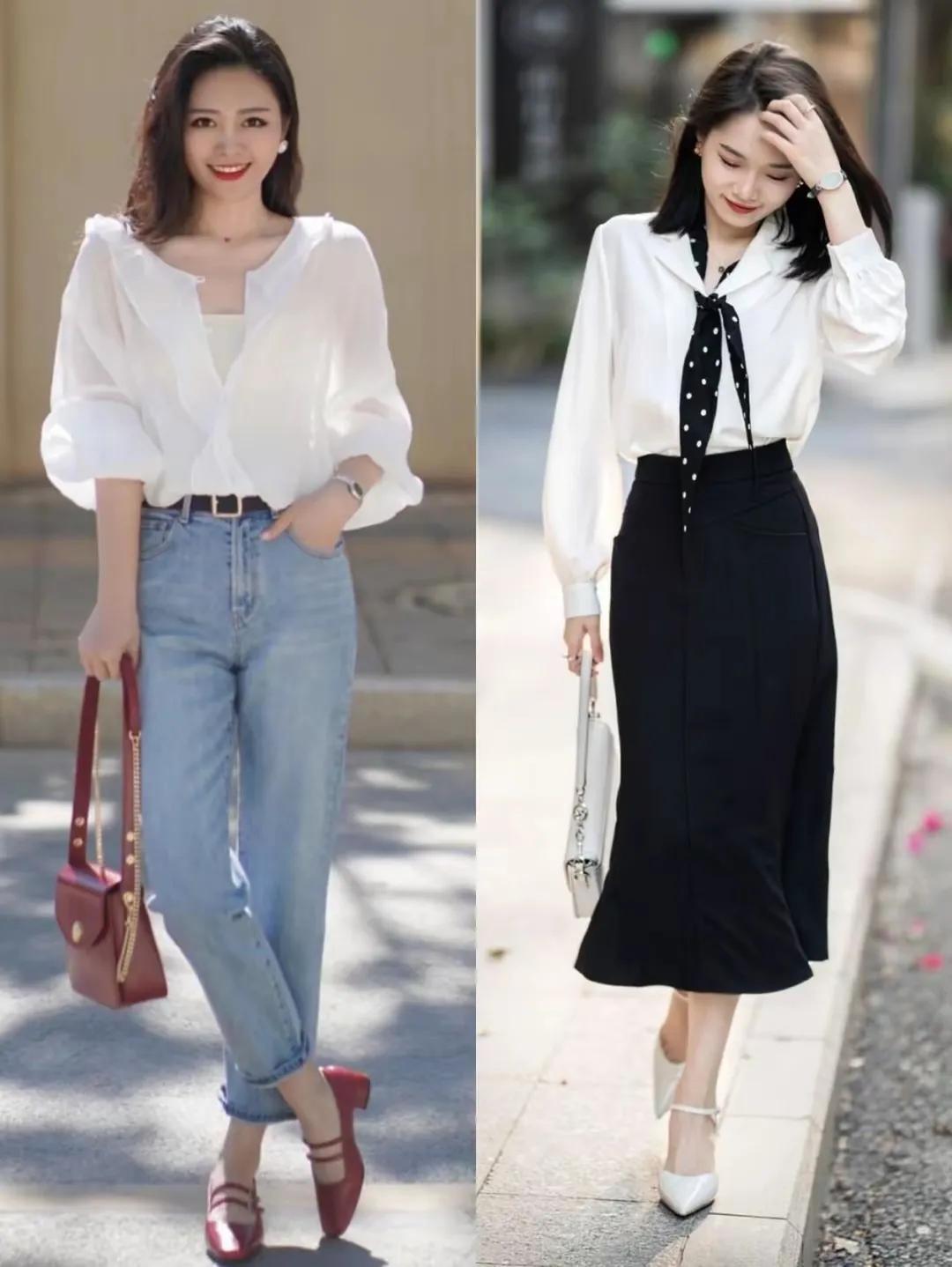 在南边的话,我们如故招揽一件有明朗感的白色衬衫上衣,搭配上灰色的半身裙