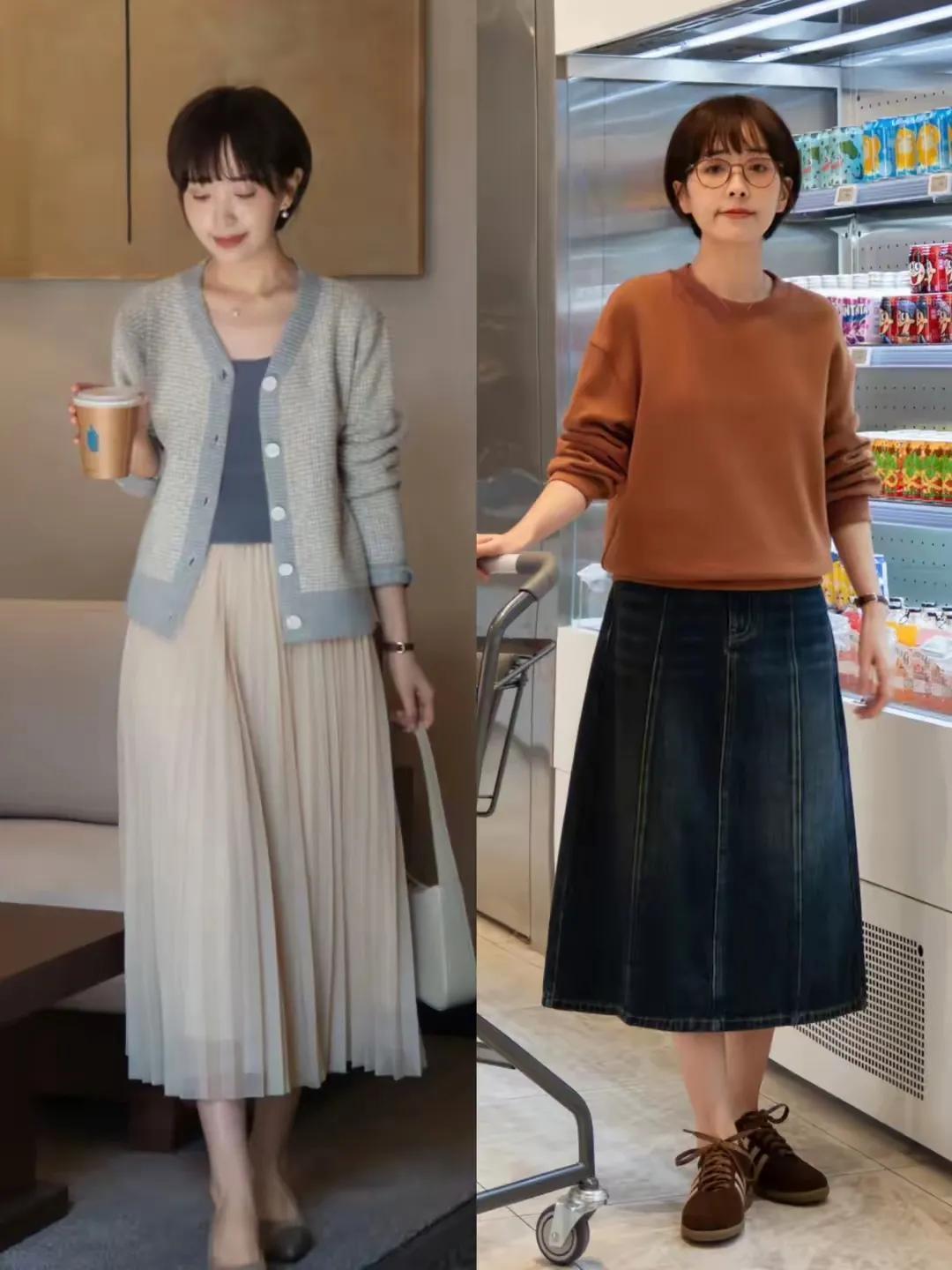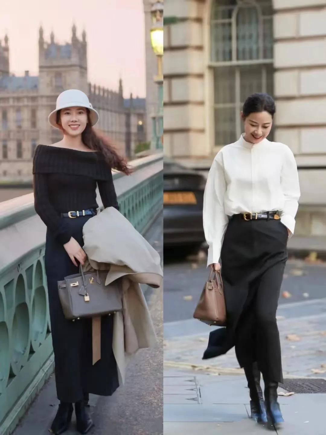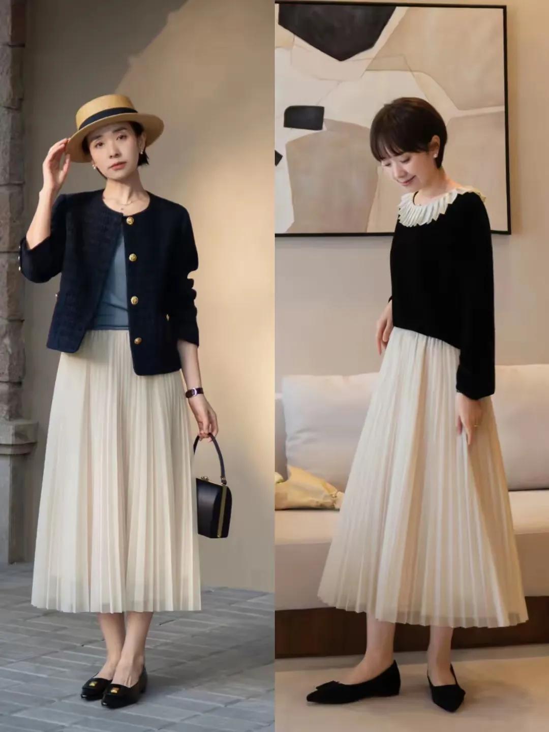 简略换成玄色的真挚上衣,搭配上杏色的百褶半身裙,酿成一个撞色的成果,也能很好的呈现出腰线的位置,一样也能达到显高显瘦的成果。
