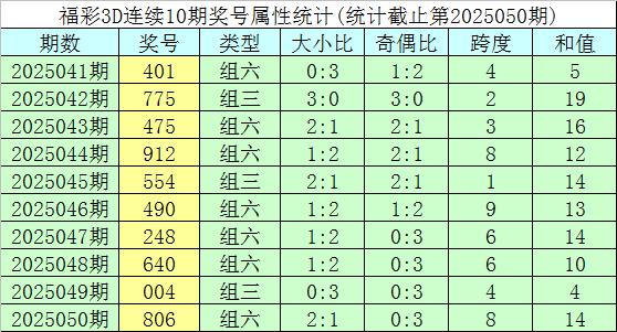 开奖追溯:福彩3D第2025050期奖号为806。奖号样式为组六,大小样式为大小大,奇偶样式为偶偶偶,和值为14,跨度为8。