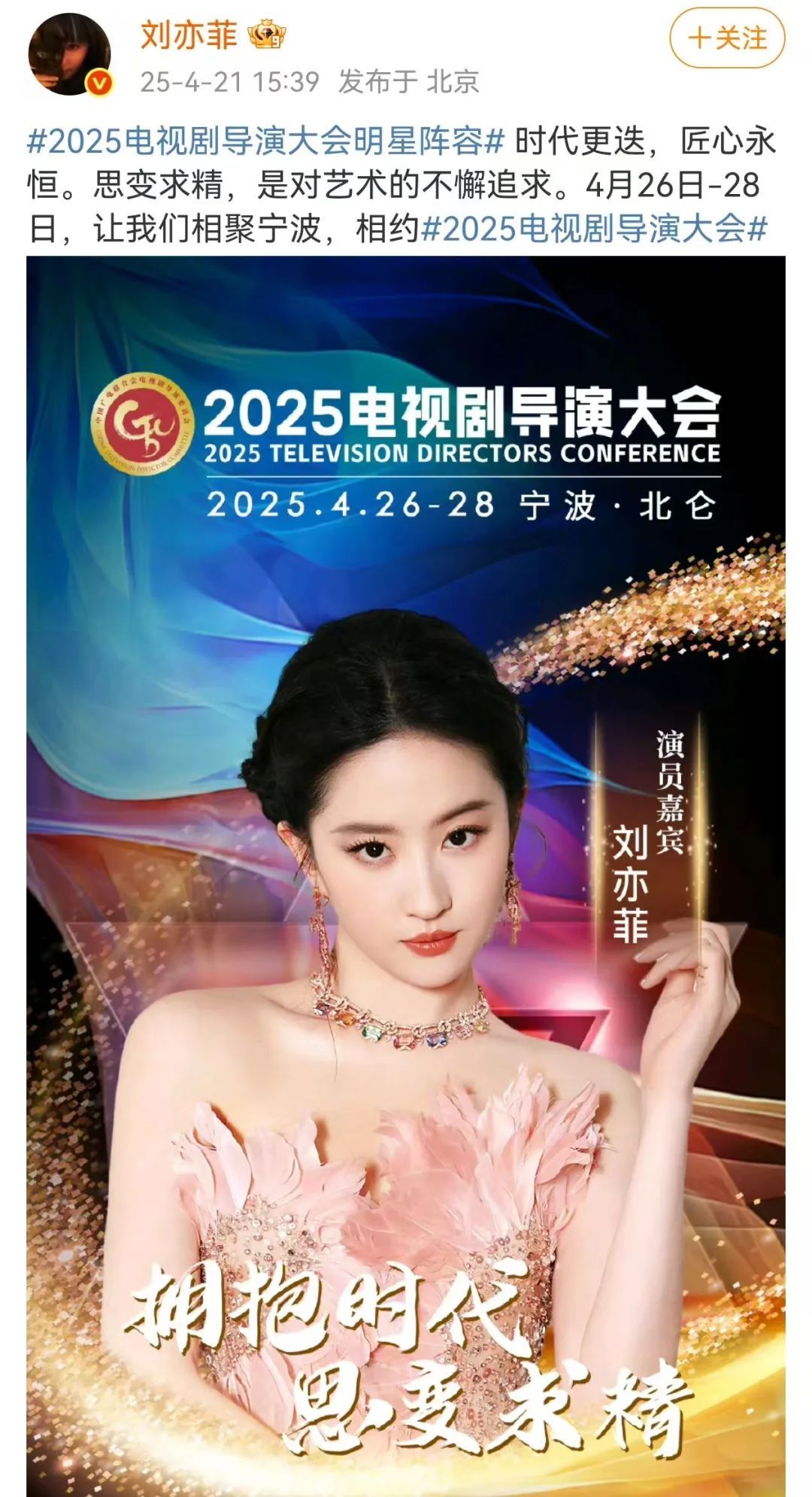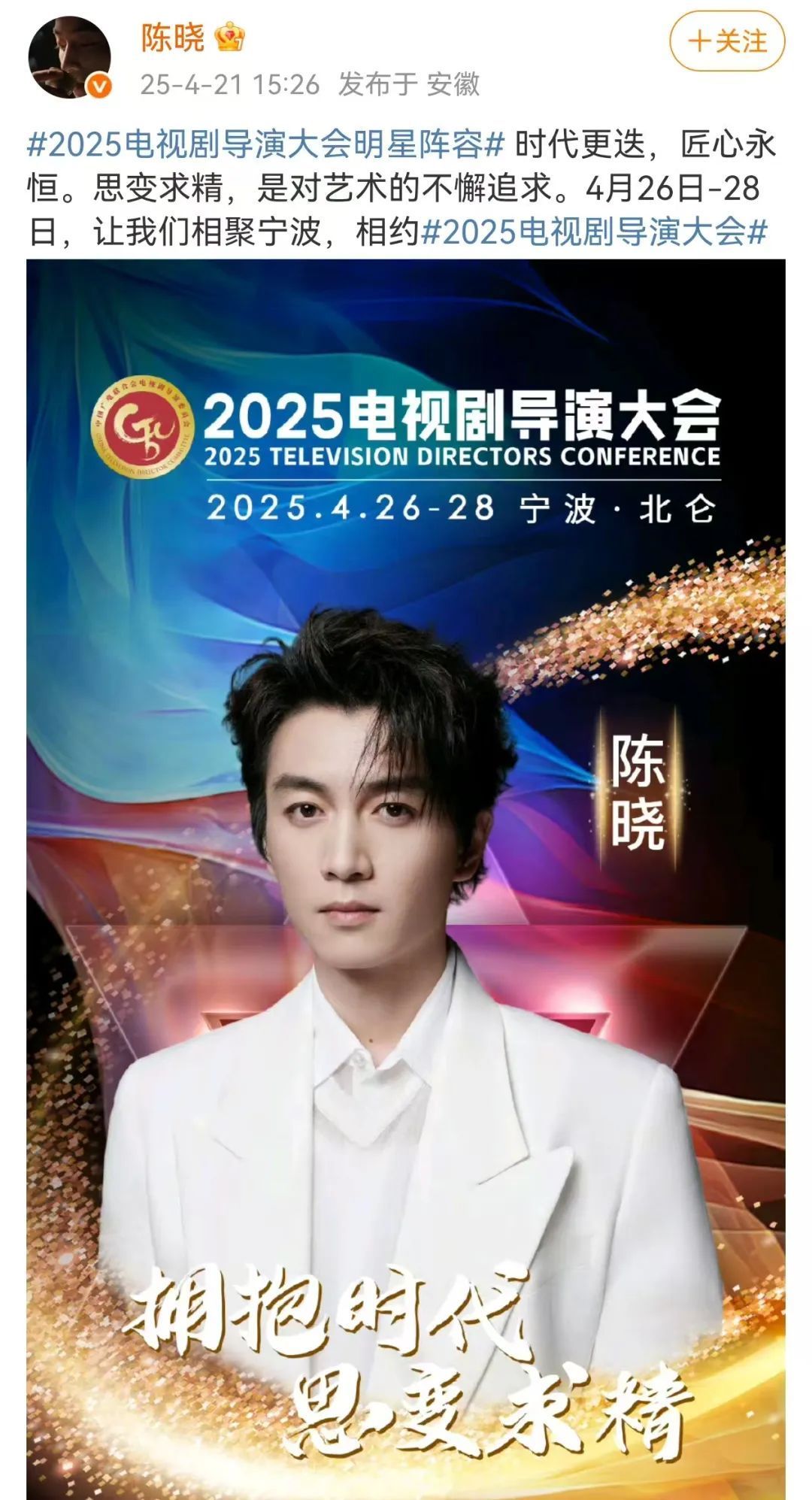 4月21日下昼,演员陈晓、刘亦菲接踵在个东说念主酬酢平台发文称:期间更替,匠心不灭。想变求精,是对艺术的不懈追求。4月26日-28日,让咱们蚁合宁波,相约2025电视剧导演大会。