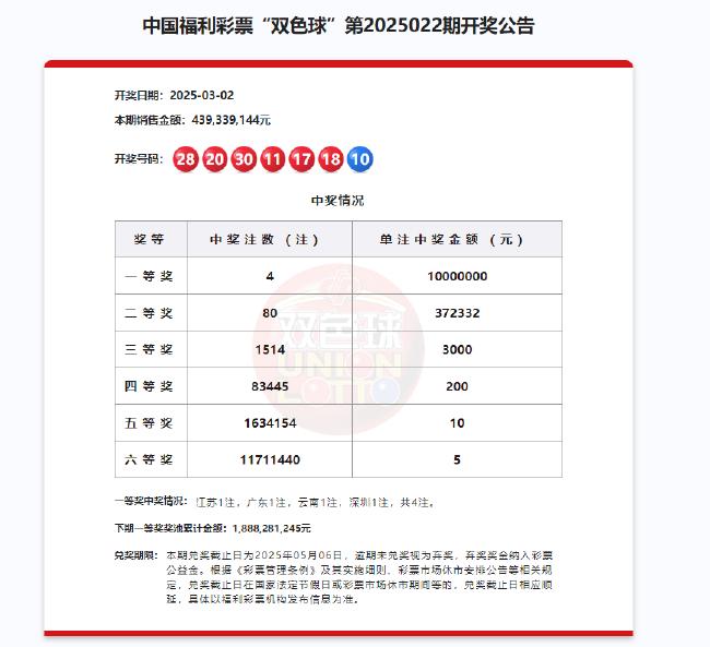 22:08 本期一等奖开出4注,单注奖金1000万元,分落4地,江苏、广东、云南和深圳各1注。二等奖开80注,单注奖金37.2万余元。本期双色球宇宙销量为4.39亿元,计奖范畴后奖池余额为18.88亿余元。