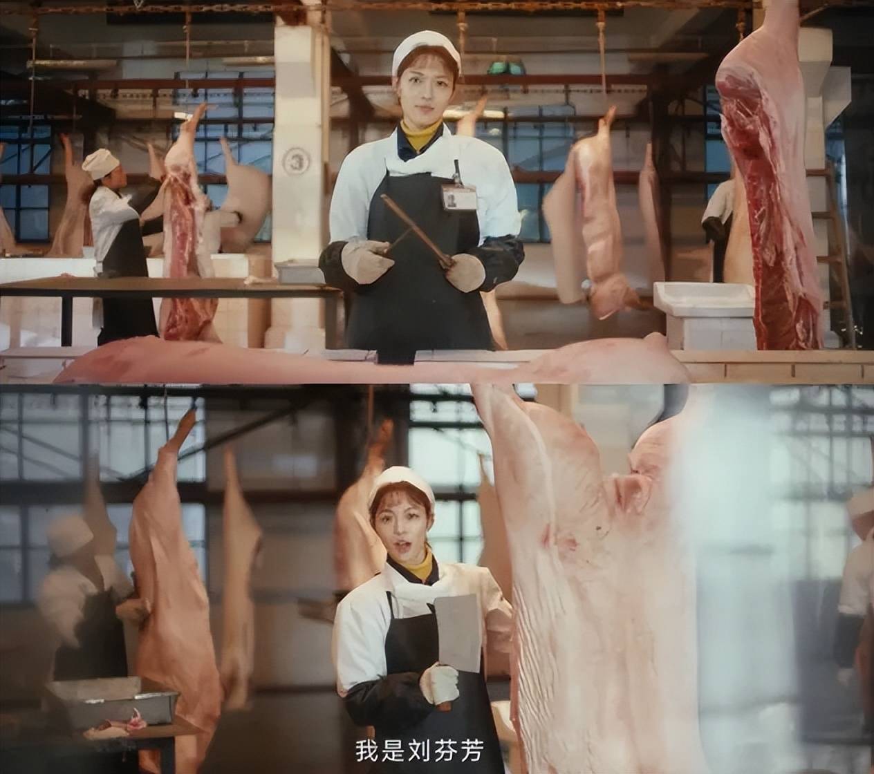 她衣服围裙,戴着袖头和手套,手里拿着砍刀,精真金不怕火扛起几十斤的半扇猪,手起刀落分割猪肉。