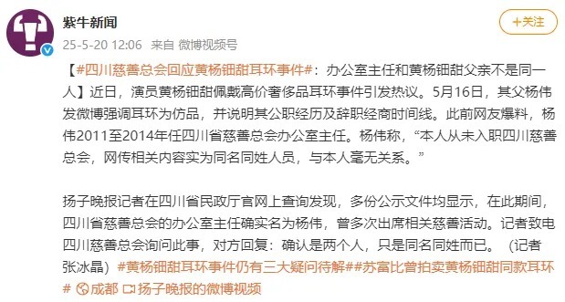 此外,还有讯息称,黄杨钿甜的父亲杨伟2011至2014年任四川省慈善总会办公室主任,称其得当雅安地震灾后重建样式,怀疑其涉嫌侵吞灾后重建资金。对此,杨伟称,“本东谈主从未入职四川慈善总会,网传相关本色实为同名同姓东谈主员,与本东谈主毫无关系。”
