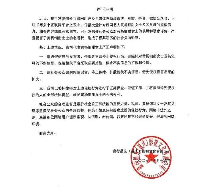 5月16日,@嘉行传媒 发布严正声明:社会公众的合理监督是贵重社会刚正和法治的迫切力量,我司、黄杨钿甜女士相等父母快意袭取社会公众的合理监督,但毫不姑息任何坏心申斥的侵权步履,恳请全球勿信谣、勿传谣。