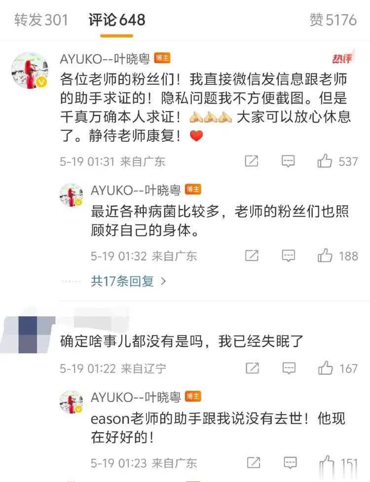 5月19日凌晨,歌手叶晓粤发文称陈奕迅死字是假新闻。叶晓粤暗示我方和陈奕迅的助手求证了,“死字新闻”是假的,他咫尺东谈主好好的。