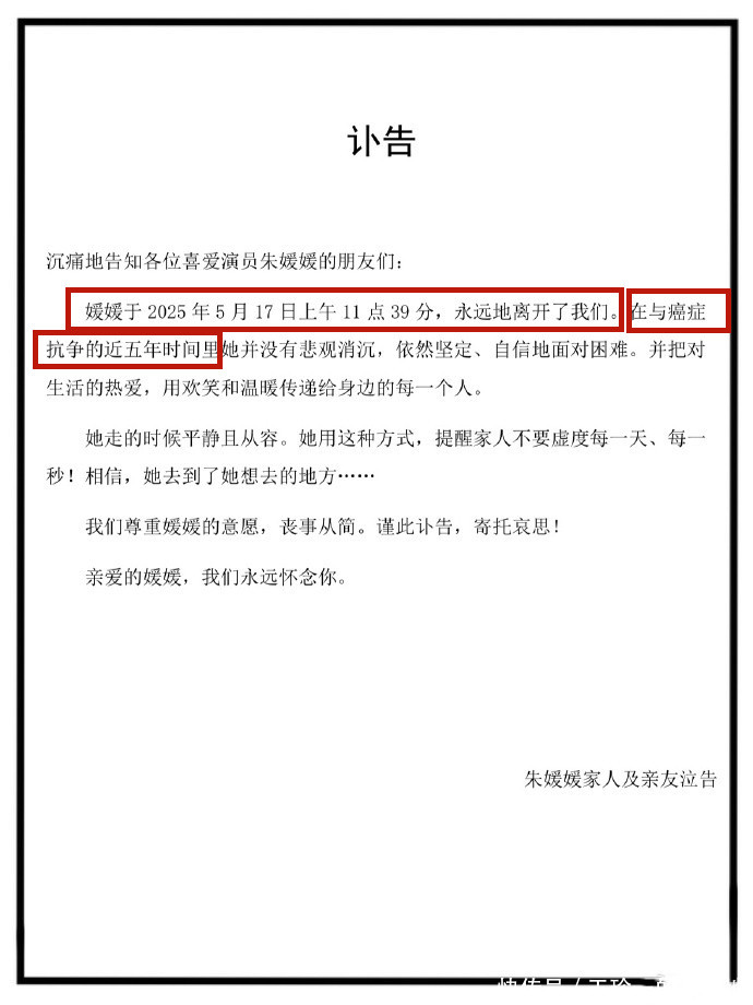 此外,讣告披露,朱媛媛生前患有癌症,她与癌症拒抗了近5年。