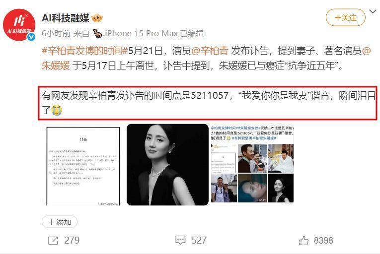网友发现辛柏青发布浑家讣告的时辰大有含义,装束着辛柏青对浑家的爱。