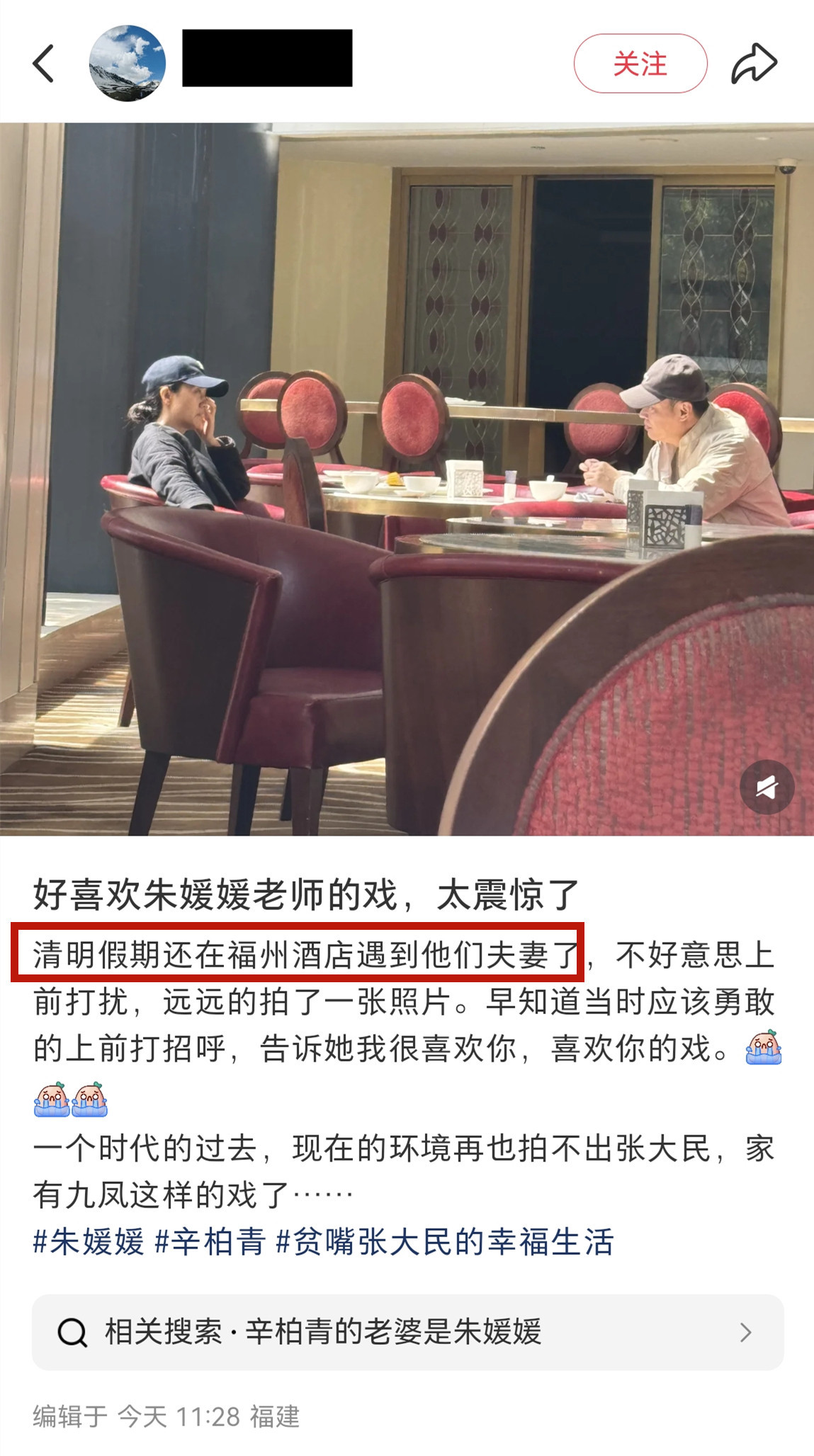 还有网友曝光本年的辉煌节假期,在福州的一家栈房偶遇了辛柏青朱媛媛佳偶,他们其时在栈房的餐厅一边吃饭一边聊天。