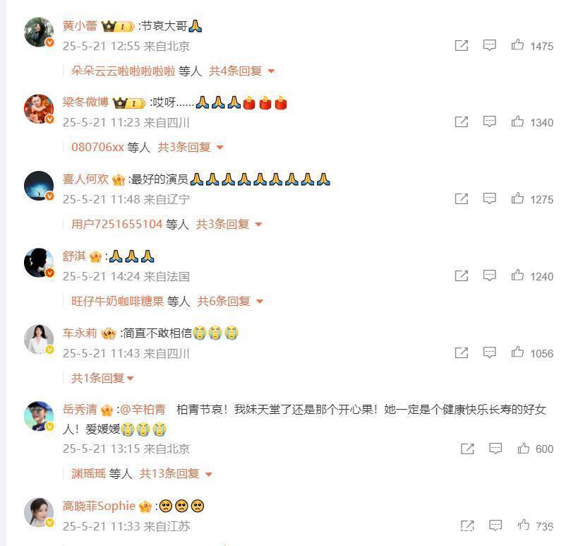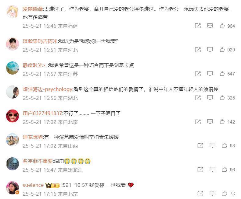 辛柏青发布讣告的时辰是5月21日10点57分,网友觉得这是“我爱你你是我妻”的谐音。