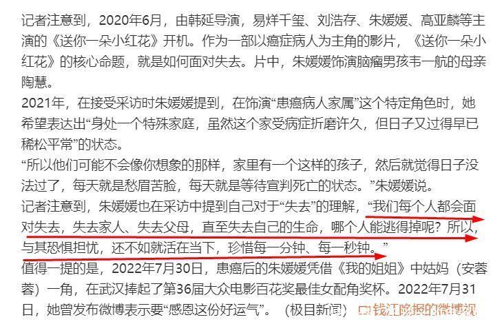 在《送你一朵小红花》上映之后,朱媛媛罗致媒体采访曾谈到了存一火,谈到了失去,她说“咱们每个东说念主齐会面临失去,失去家东说念主、失去父母,直至失去我方的人命,哪个东说念主能逃得掉呢?是以,与其胆寒担忧,还不如就活在当下,襄助每一分钟、每一秒钟。”