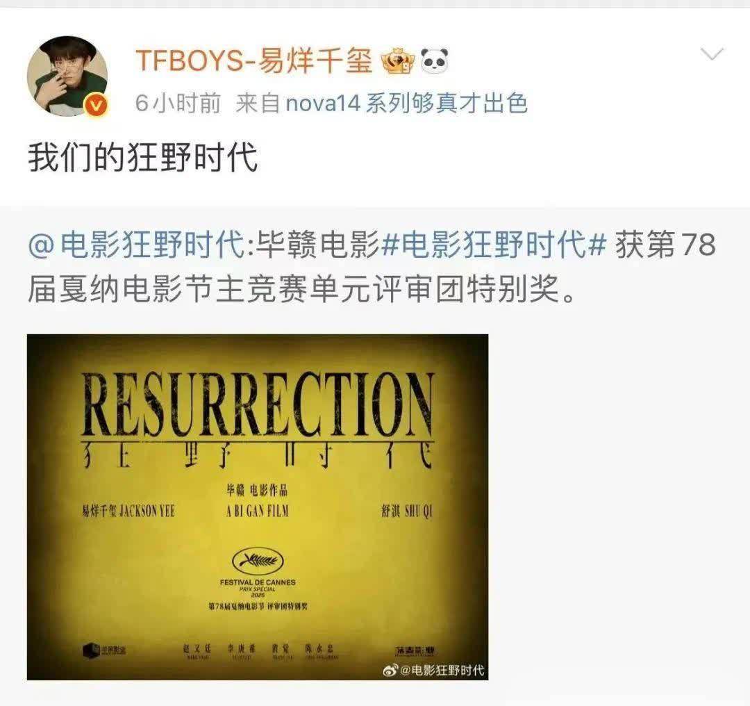 《狂野时间》获奖后,主演@TFBOYS-易烊千玺转发电影获奖微博,配文:“咱们的狂野时间”。